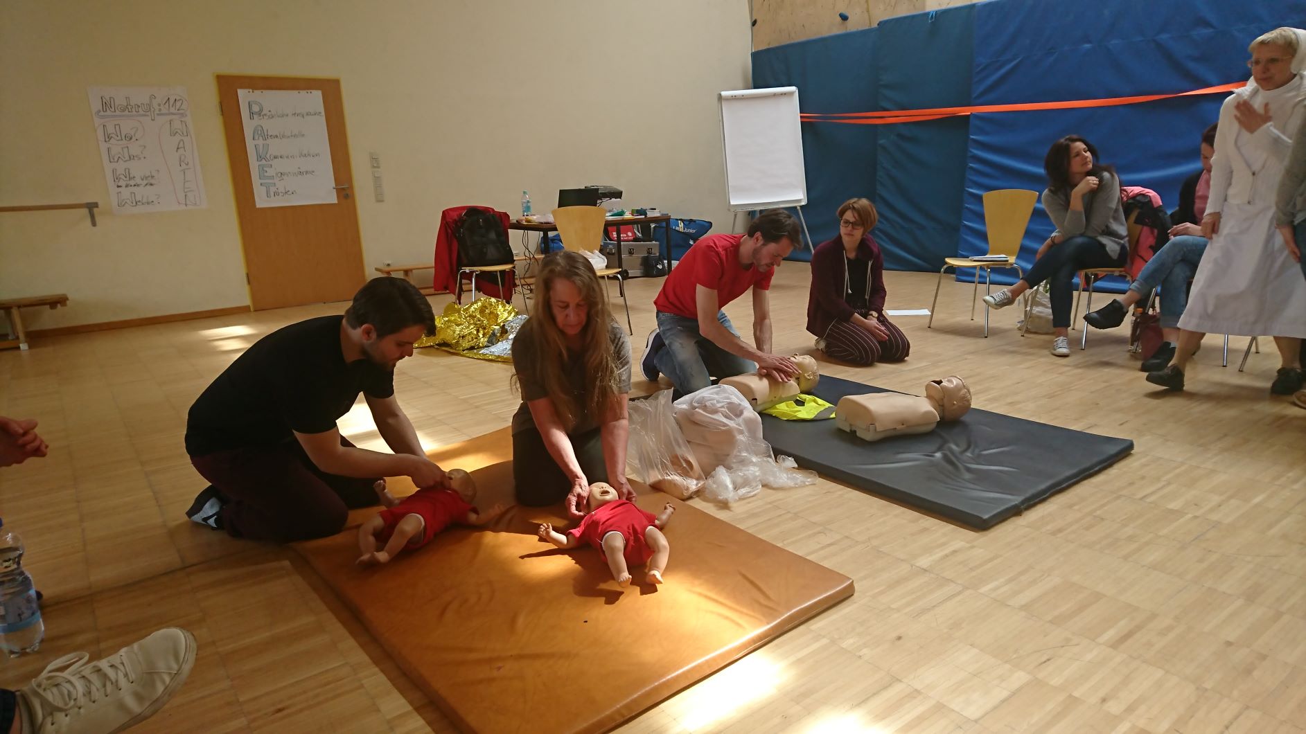 Alle Pädagogen nehmen regelmäßig an den Fortbildungsangeboten zur Ersten-Hilfe teil. Die Pädagogen der Gruppen, in denen Kleinstkinder untergebracht werden können, werden zusätzlich jährlich in Erster-Hilfe am Kleinkind und Reanimation am Kleinkind durch Dr. Ehrchen von der Asklepios Kinderklinik in St. Augustin geschult.