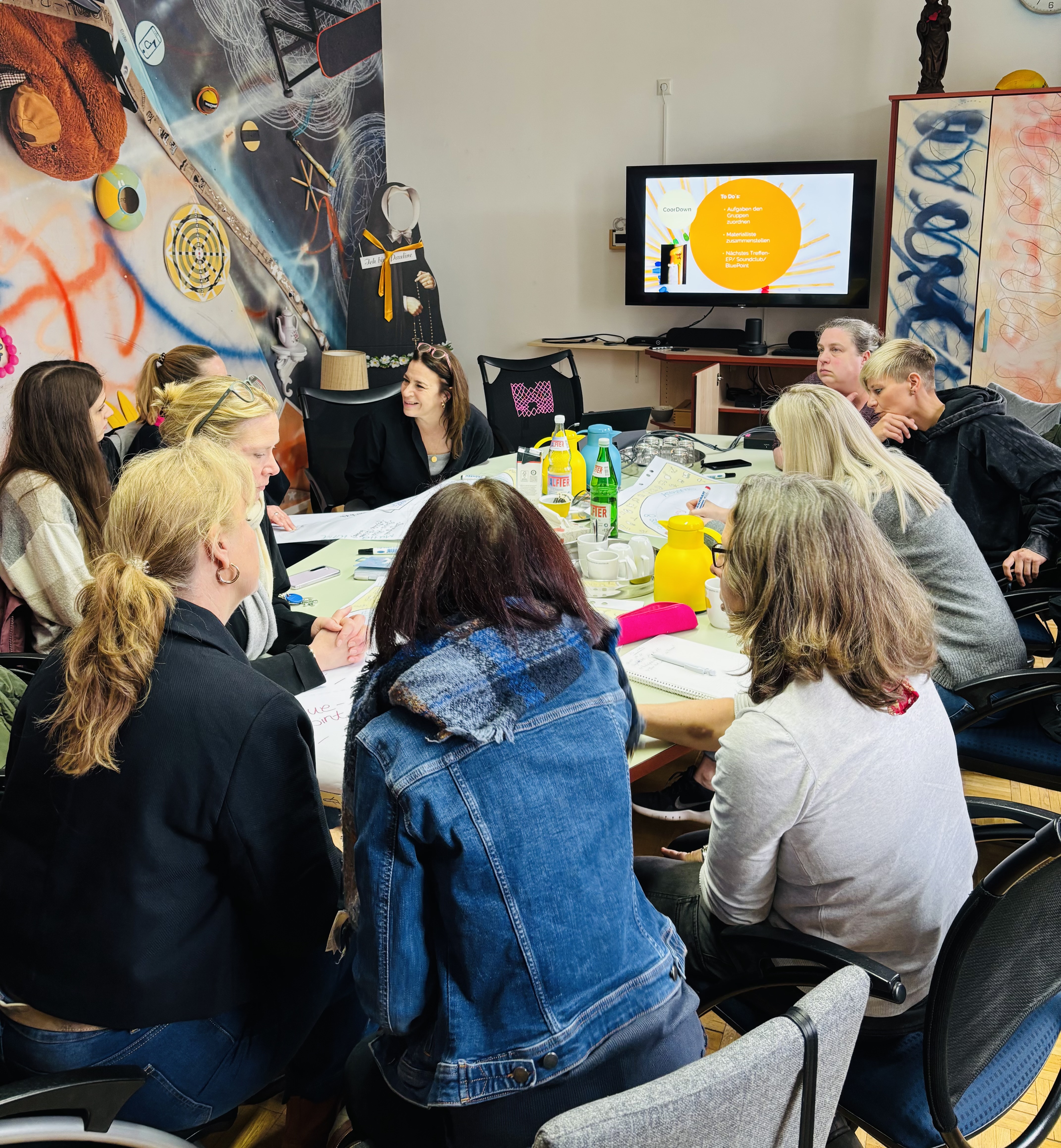 Das Ziel dieser Gruppe ist es, sich gemeinsam mit dem Thema „Inklusion“ zu beschäftigen. Sie wollen herausfinden, wie sie Inklusion in der ganzen Einrichtung verbessern können. Die Teilnehmerinnen und Teilnehmer sprechen darüber, wie man eine inklusive Haltung entwickeln kann.