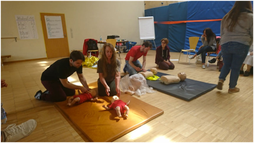 Zuvor benannte Unsicherheiten und offene Fragen wurden im Laufe des Tages behoben. Alle Kollegen und Kolleginnen übten sich mit viel Freunde und Engagement als Ersthelfer und führten die verschiedenen Maßnahmen wie z.B. Wunden verbinden, stabile Seitenlage und Wiederbelebung durch.