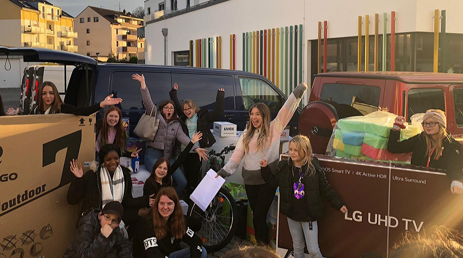 Um 15.00 Uhr kamen dann viele, viele Kinder und Jugendliche auf den Hof. Bibi übergab jeder Gruppe ein großartiges Gruppengeschenk – Fahrradhelme, Toonie-Boxen, eine Outdoor-Tischtennisplatte, Eventim-Gutscheine uvm.