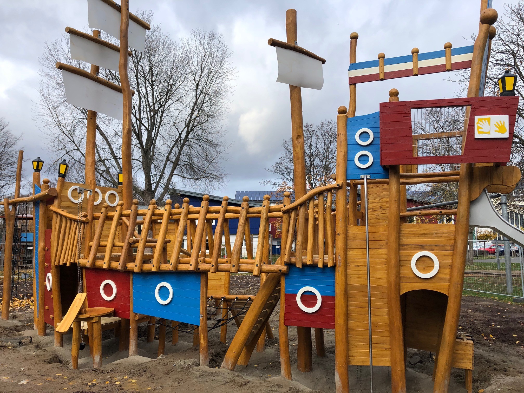 Unglaublich aber wahr: viele Jahre haben wir für dieses Schiff gespart. Nun ist es uns gelungen rein über Spenden, Stiftungs- und Fördergelder das Schiff zu kaufen. In den letzten zwei Wochen wurde das Schiff aufgebaut und liegt nun vor Anker. Bis Anfang Januar müssen die Fundamente trocknen, dann endlich können die Kids das 19x10m große Spielgerät entern. Die Spannung ist groß und das Warten fällt schwer. Gestern wurden noch 70m³ Sand verteilt – selbst dieser gespendet!