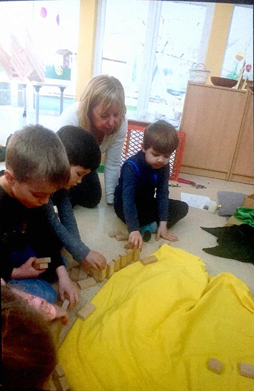 Zu Beginn legten wir einen Reifen in die Mitte, dort wurde ein goldenes Tuch hinein gelegt – als Zeichen für die goldene Stadt Jerusalem. Mit Bausteinen bauten die Kinder Mauern um diese Stadt, Häuser hinein, sowie Stadttore. Mit den Tüchern winkten sie, wie die Menschen damals und legten Wege zu den Stadttoren.