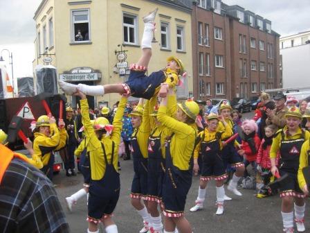 Neben der großen traditionellen Kindersitzung am Samstag, bei der die Siegburger Prinzenpaare und die Kindertanzgarden der Grün-Weißen und Schwarz-Weißen zu Gast waren, gingen Kita und Kinderheim am Sonntag verkleidet als Bauarbeiter mit im Wolsdorfer Veedelszoch. Mit 150 Personen bildete die Pauline die größte Gruppe in dem urigen Veedelszoch. Rosenmontag ging es dann in kleinerer Besetzung und - wer hätte das gedacht - bei schönem Sonnenschein und steifer Brise, im Zoch durch die Kreisstadt. Bei beiden Zügen begeisterte die heimeigene Tanzgruppe "Pauline Funken" mit ihrem Bauarbeiter-Tanz.