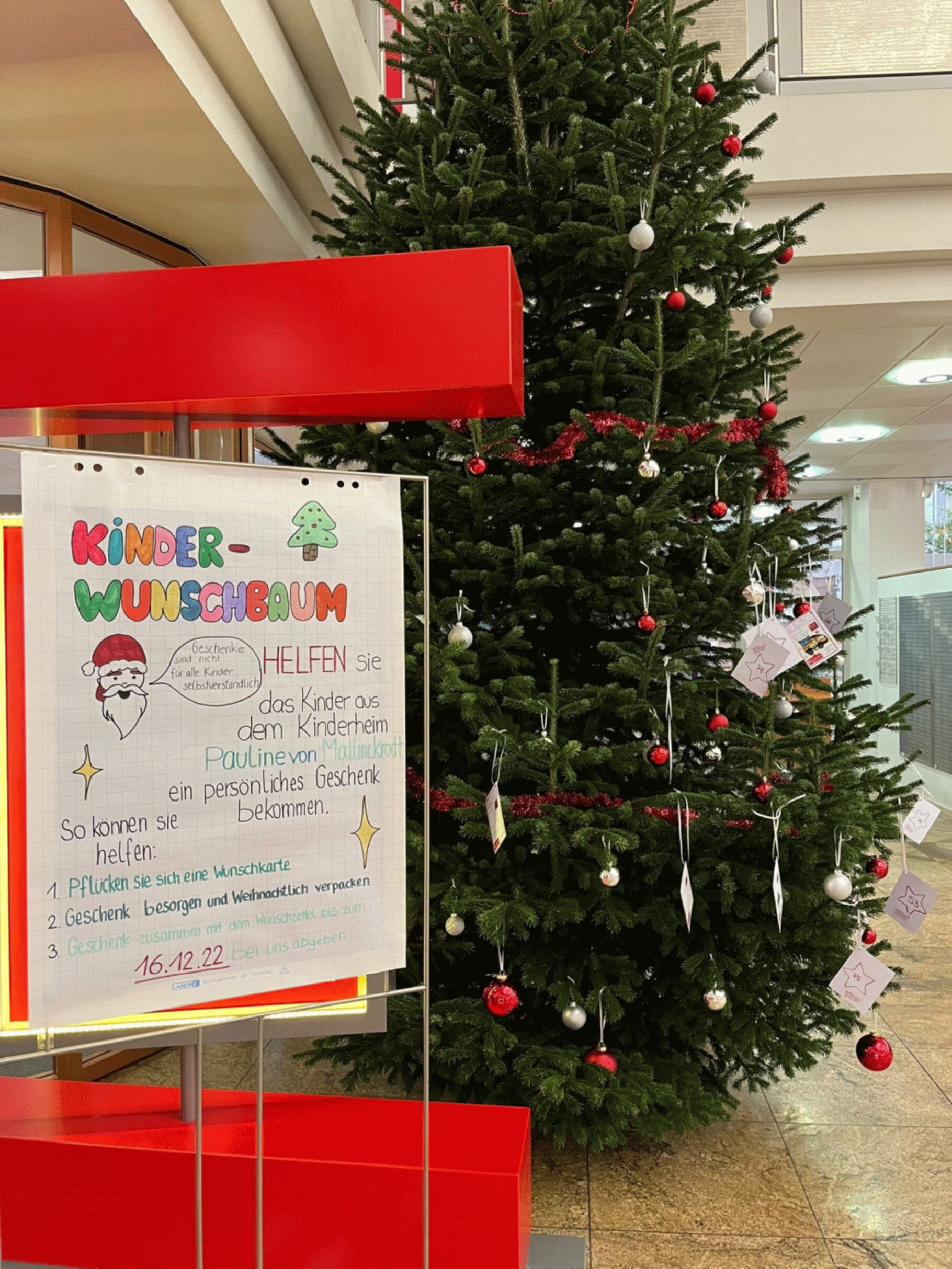132 Wunschzettel schmücken den Baum, der in der Filiale "An der Stadtmauer" in Siegburg steht. Die Kunden können sich einfach einen Wunsch vom Baum pflücken und das Geschenk bis zum 16.12.2022 in der Filiale abgeben.