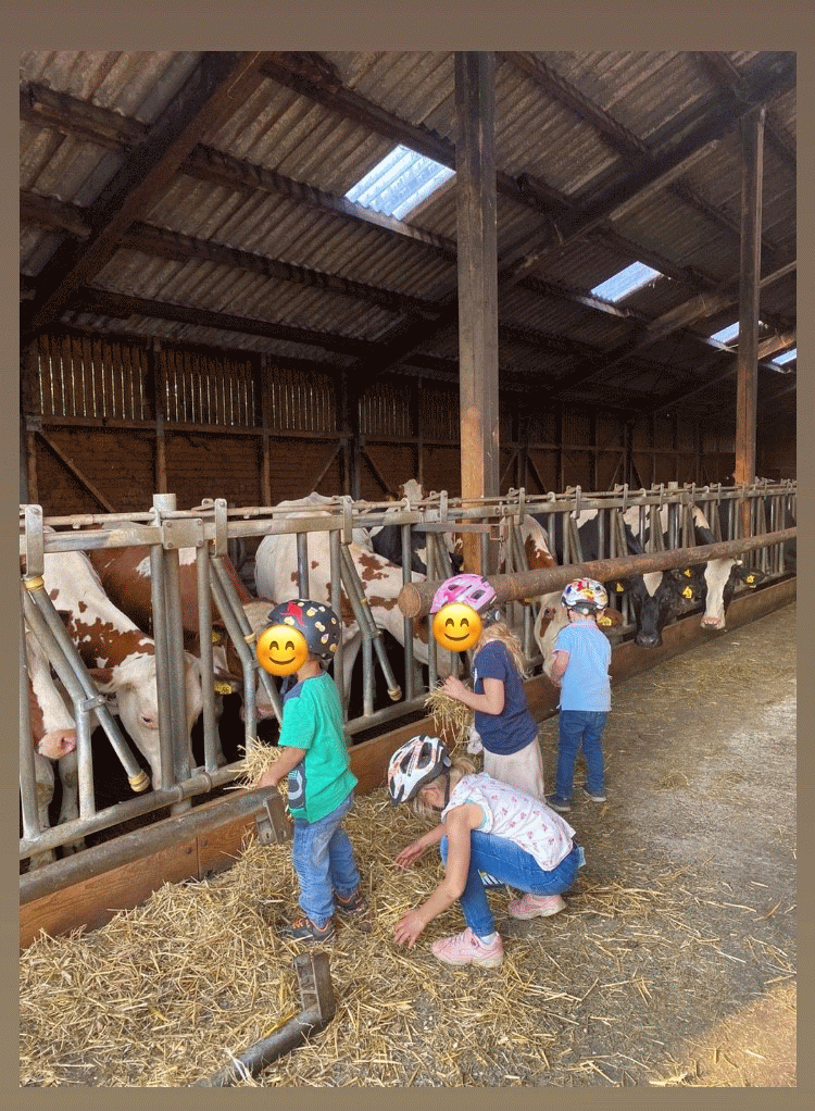 Anschließend besuchten wir den Reiterhof „Pferdefreunde Schalenbach e.V.“. Dort durften wir abwechselnd auf dem Pony „Shorty“ zu einem Milchbetrieb reiten und zusehen, wie die Kühe dort gemolken werden und konnten auch die frische Milch probieren. Bei dem Milchbetrieb der Familie Rauchholz wäre der ein oder andere schon beinahe direkt eingestellt worden, so fleißig haben die Kolibris versucht jede Kuh mit ausreichend Heu zu versorgen.