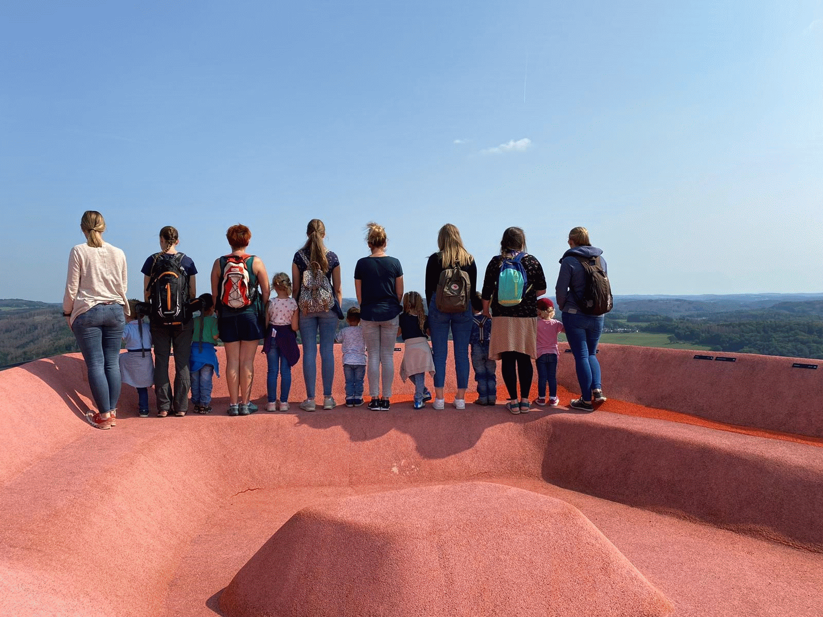 Über eine unendlich lange Treppe, die links und rechts von informativen Mülltonnen gesäumt war, die uns mal mit Bildern, Texten und mal mit Audiodateien die Mülltrennung erklärten, gelangten wir auf den Gipfel des Berges, von wo aus wir den ganzen Baggern und LKW bei der Arbeit zu gucken konnten. Auf dem Gipfel angekommen, waren die Trampoline, sowie eine coole Rutsche ein besonderes Highlight, für welche, die Kolibris auch x mal bereit waren, die Treppe hoch und runter zu rennen.