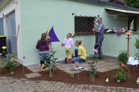 24 Siegwerker bevölkern gerade den Garten unserer AWG Sonnenhaus...nein, sie halten hier kein Sonnenbad (es regnet) oder erholen sich von ihrem Arbeit beim Druck- und Farbenhersteller. Im Gegenteil: sie packen mit an und gestalten in einer Ganztagesaktion den doch sehr verwilderten Garten unserer AWG um. Beete werden vom Unkraut befreit, Spielgeräte und Wände bunt bemalt, Blumen gepflanzt, ein Weidentipi entsteht. Ein ganzer Container ist schon voll mit Unrat. Ein Traktor unterstützt die Mannschaft bei ihrer Arbeit. Und auch die Kinder und Jugendlichen des Sonnenhauses sind begeistert bei der Sache.