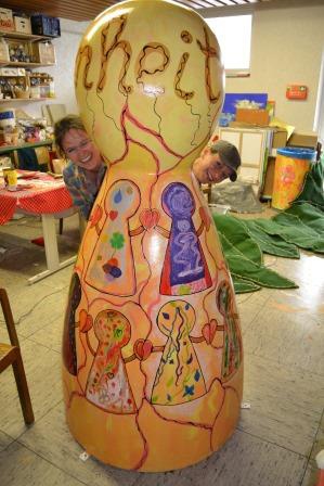 Schon seit Wochen arbeitet die Kunstgruppe des Kinderheims an dem Projekt "Spielekegel". Hier galt es nicht nur, einen Kegel, der immerhin 1,80m hoch ist, zu gestalten, sondern dem Kegel einen Sinn zu verleihen. Kinder und Jugendliche in Einrichtungen der Jugendhilfe haben es sicherlich oft schwerer im Leben als gleichaltrige Kameraden, doch heißt dies noch lange nicht, dass ihnen die Zukunft verschlossen ist. Im Gegenteil: die Kinder und Jugendlichen unserer Einrichtung bringen ein großes Potential an Stärken und Kompetenzen mit, die auch ihnen die Zukunft öffnen. Dies zu zeigen, ist Anliegen des großen Kunstprojekts.