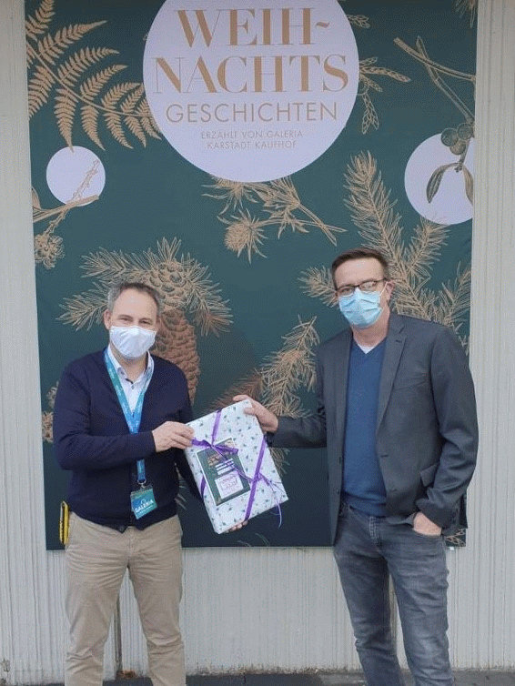 Stellvertretender Heimleiter Thomas Fischer-Wesselmann konnte hochvolle Körbe mit liebevoll eingepackten Geschenken von Torsten Aussem in Empfang nehmen.