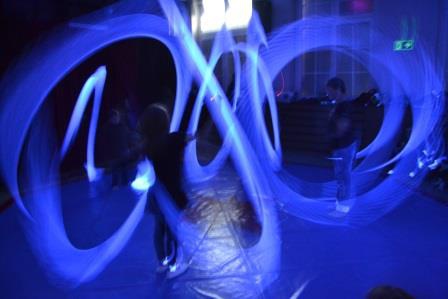Ein Poi ist ein Seil, wo ein Tuch dran ist, mit dem man schwingen konnte. Besonders schön ist, dass die Tücher im Schwarzlicht leuchteten. Es war ganz schön anstrengend eine Choreographie einzuüben.
