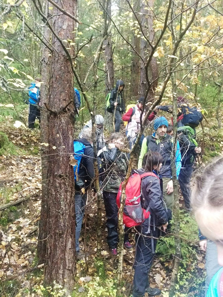 hatten die heutige Strecke unter die hoffentlich wasserdichten Schuhe genommen. Nach einigen Wirrungen, es war den Vorgehendem scheinbar die sinnmachende Richtung abhandengekommen, fand man dann doch den richtigen Weg. Die sich in aller Ruhe noch die Schuhe Zubindenden jauchzten. Sie hatten sich durch ihre Trödelei zusätzliche Wege erspart. Aber auch der folgende Weg war schwierig und war ohne „Mut zur Lücke“ oft nicht zu finden. Die Natur ist kein leicht zu überzeugender und selten zu besiegender Gegner. Die mit Mühe geschlagenen Kolonnenwege, die bergauf und bergab durch die Wälder führten, waren kaum noch zu erkennen. Nur noch selten fanden sie noch einen intakten Weg, denn der Wald hat längst begonnen in aller Ruhe aber mit großer Konsequenz, den ruhmlosen Ort zurück zu erobern. Oft ließen nur noch einzelne Steine einen möglichen Weg erahnen. Ganze Teile waren als kleine Lawine den Berg hinuntergespült worden, andere waren durch den dichtstehenden gar nicht mehr jungen Wald unpassierbar geworden. Durch Büsche, bergauf und –ab schlugen sie sich tapfer durch die Wildnis und nur mit viel Glück aber auch einer großen Portion Pfadfindertum fanden sie immer wieder Überbleibsel des Weges und damit die korrekte Richtung. Und das trotz des unaufhörlichen, die Kleidung durchdringenden Regens. Nach vielen Stunden Fußmarsch und langsam auskühlenden Körpern erreichte die tapfere Schar endlich den Zielpunkt, wo die Busse sie erwarteten. Die Rückfahrt war für einige ein einziger Kampf, denn die Heizung wärmte zwar den Körper, ließ aber trotz heftiger Gegenwehr die Augen wie von Geisterhand zufallen.